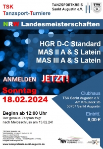 Wir freuen uns, in unserem Clubhaus in folgenden Klassen die Landesmeisterschaften NRW 2024 durchführen zu können: HGR D und C Standard MAS II A und S Latein MAS III A und S Latein weitere Informationen folgen...