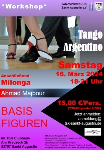Der Tanzsportkreis Sankt Augustin e.V. lädt zum zweiten Mal zu einem 3-stündigen Workshop „Tango Argentino“ mit Ahmad Majbour ein. Dieses Mal stehen "Basic"-Figuren und deren korrekte Ausführung auf dem Programm. Im Anschluss sind alle zu einer geselligen "Milonga" mit Tango-Musik bis um Mitternacht eingeladen. Eine paarweise Anmeldung ist wünschenswert: anmeldung@tsk-sankt-augstin.de